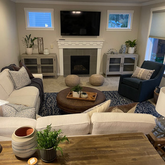 A classic mix of white or cream with Navy blue and natural tones are always a go-to for a Modern Farmhouse style. This time, my clients wanted the sectional to be the lighter performance fabric from Norwalk Furniture and contrast it with a blue swivel/glider chair.